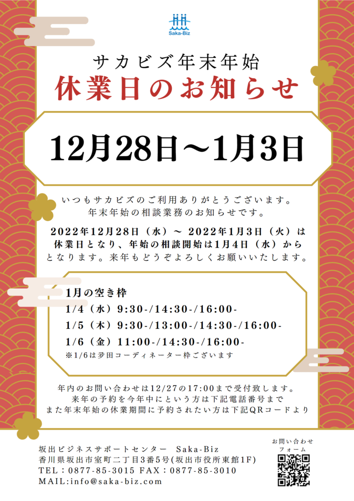 なお、年内の予約受付は12/27 17:00までに、お電話(0877-85-3015 )もしくは下記フォームより承ります。年末年始の休業中に相談予約をご希望の方は、下記フォームよりお願い致します。