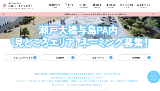瀬戸大橋総合開発(与島PA)様について、Yahooニュースにて掲載いただきました。> 瀬戸大橋 与島PAの絶景スポットのネーミング募集 香川